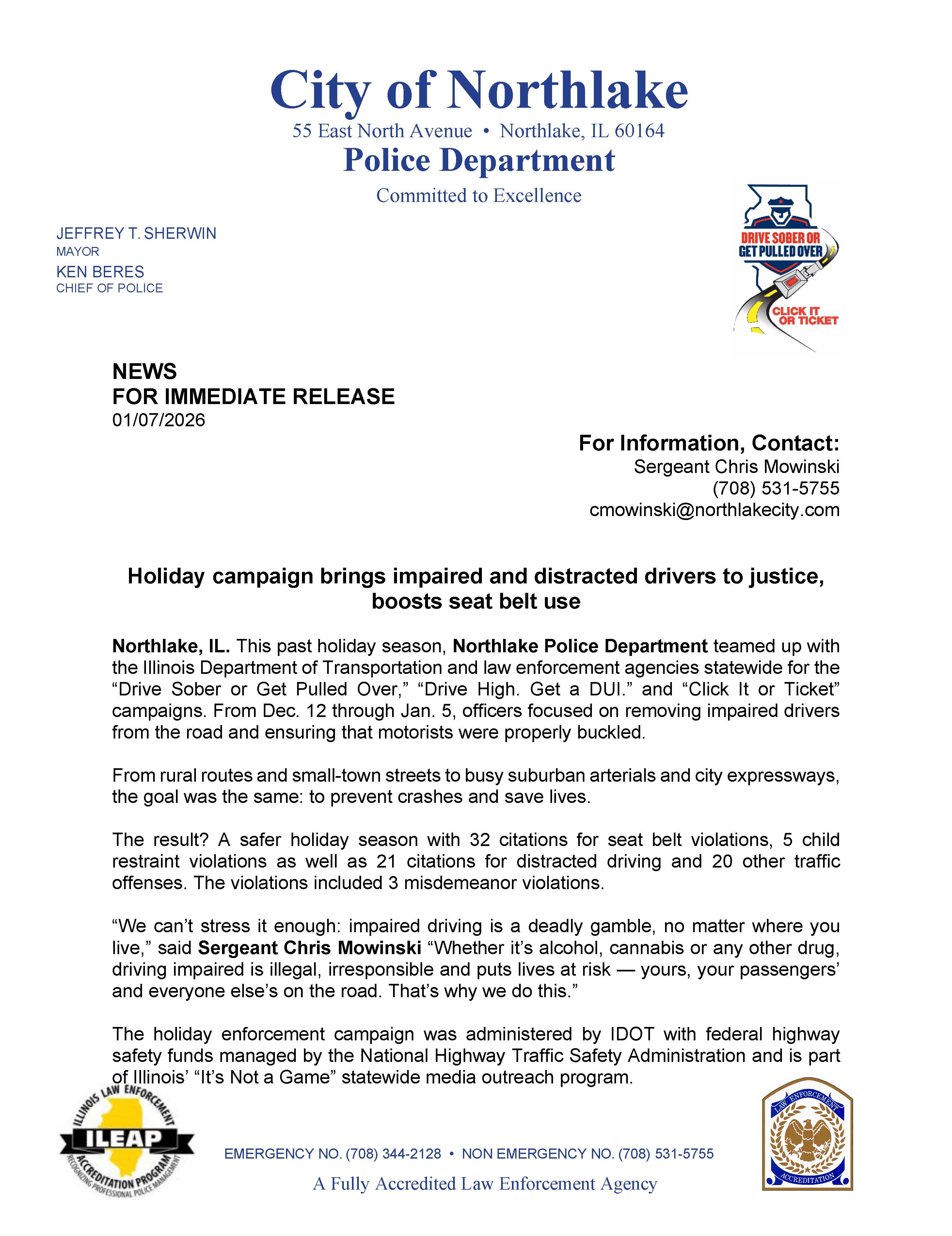 - Northlake Police Department Announces Results of Labor Day Safety Campaign